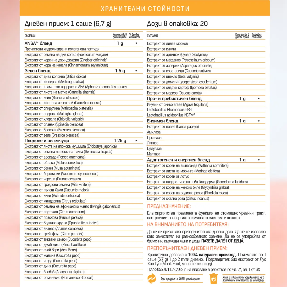 – вечер – за по-спокойна нервна система, по-леко отпускане и по-бързо заспиване.Този двуфазен подход подпомага едновременно храносмилателния комфорт, микробиома и нервното напрежение — без стимуланти, без захар и без синтетични съставки.
