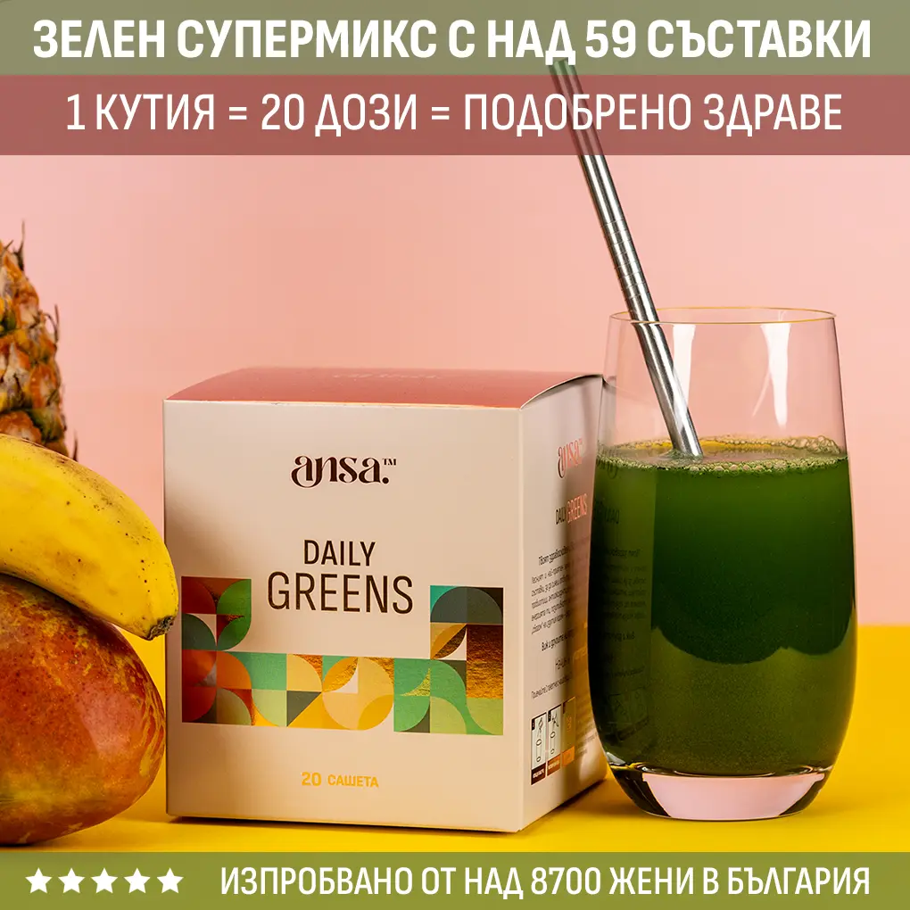 Daily Greens поддържа чревната екосистема, редовността и естествената енергия, като захранва тялото с зелени супер храни, ензими и пробиотични култури.