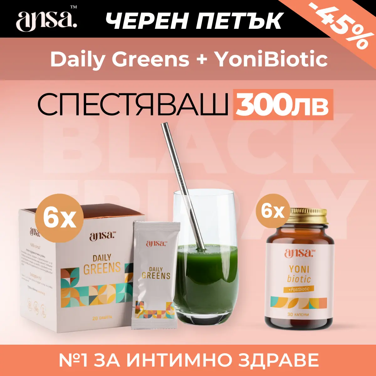 Yonibiotic и Daily Greens работят заедно всеки ден, за да ти дадат стабилност, защита и увереност в тялото ти — отвътре навън.Дай си спокойствието, лекотата и комфорта, които заслужаваш.