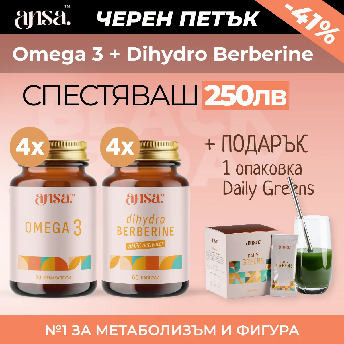 Dihydroberberine и Omega-3 работят всеки ден за по-спокоен апетит, по-добра чувствителност към инсулин и по-устойчиво изгаряне на мазнини.