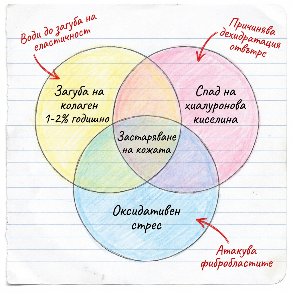 Без антиоксидантна защита, свободните радикали разрушават колагена по-бързо, отколкото тялото може да го възстанови. Водиш загубена битка.