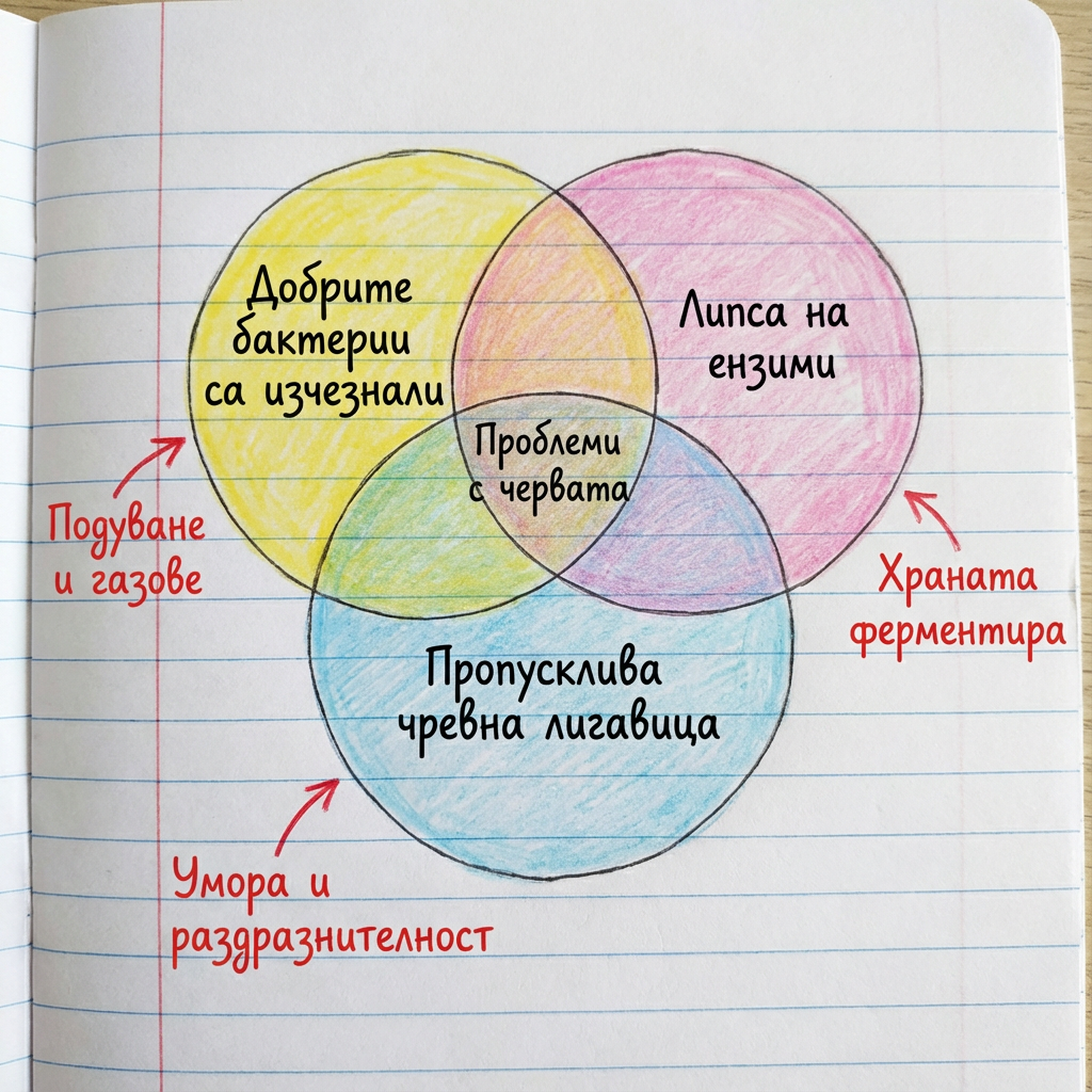 “Първо – добрите бактерии в червата ти са изчезнали. Стресът, храната, антибиотиците… всичко това ги е унищожило. Затова имаш подуване, газове, тежест.”
