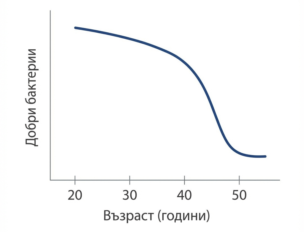 След 40 добрите бактерии в червата намаляват драстично. Затова имаш подуване, газове, запек.