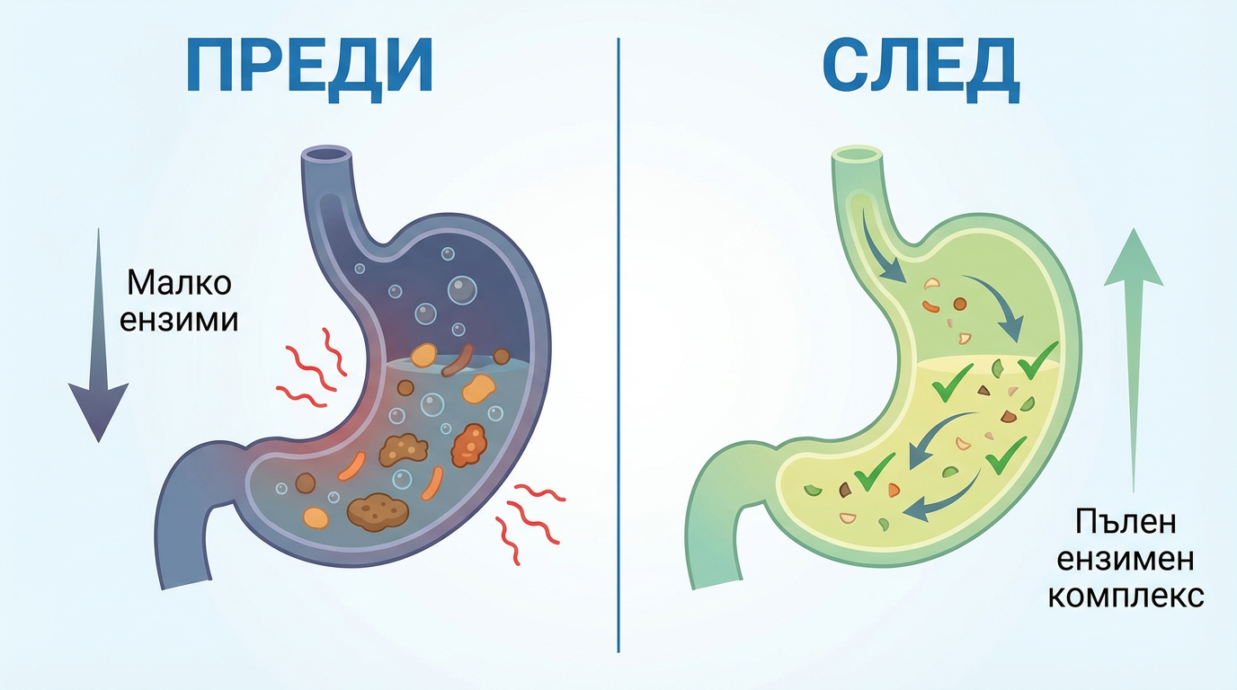 След 40 тялото произвежда по-малко ензими. Храната седи в стомаха, ферментира, създава газове и тежест.